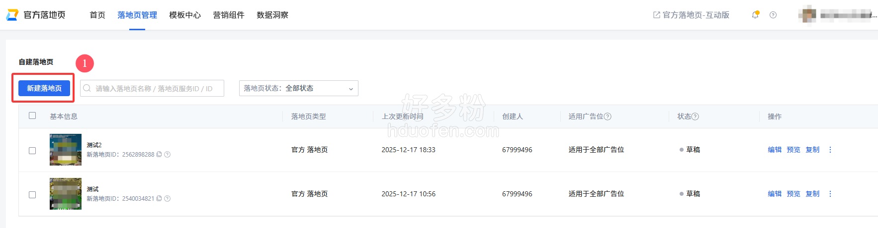 新建好的落地页在这获取落地页id,好多粉后台需要填写落地页id,可以从这里复制