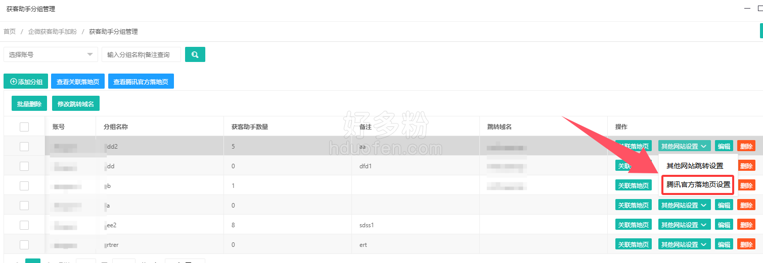 1. 好多粉后台点击企微获客助手加粉>我的获客助手>获客助手分组管理,点击腾讯官方落地页设置