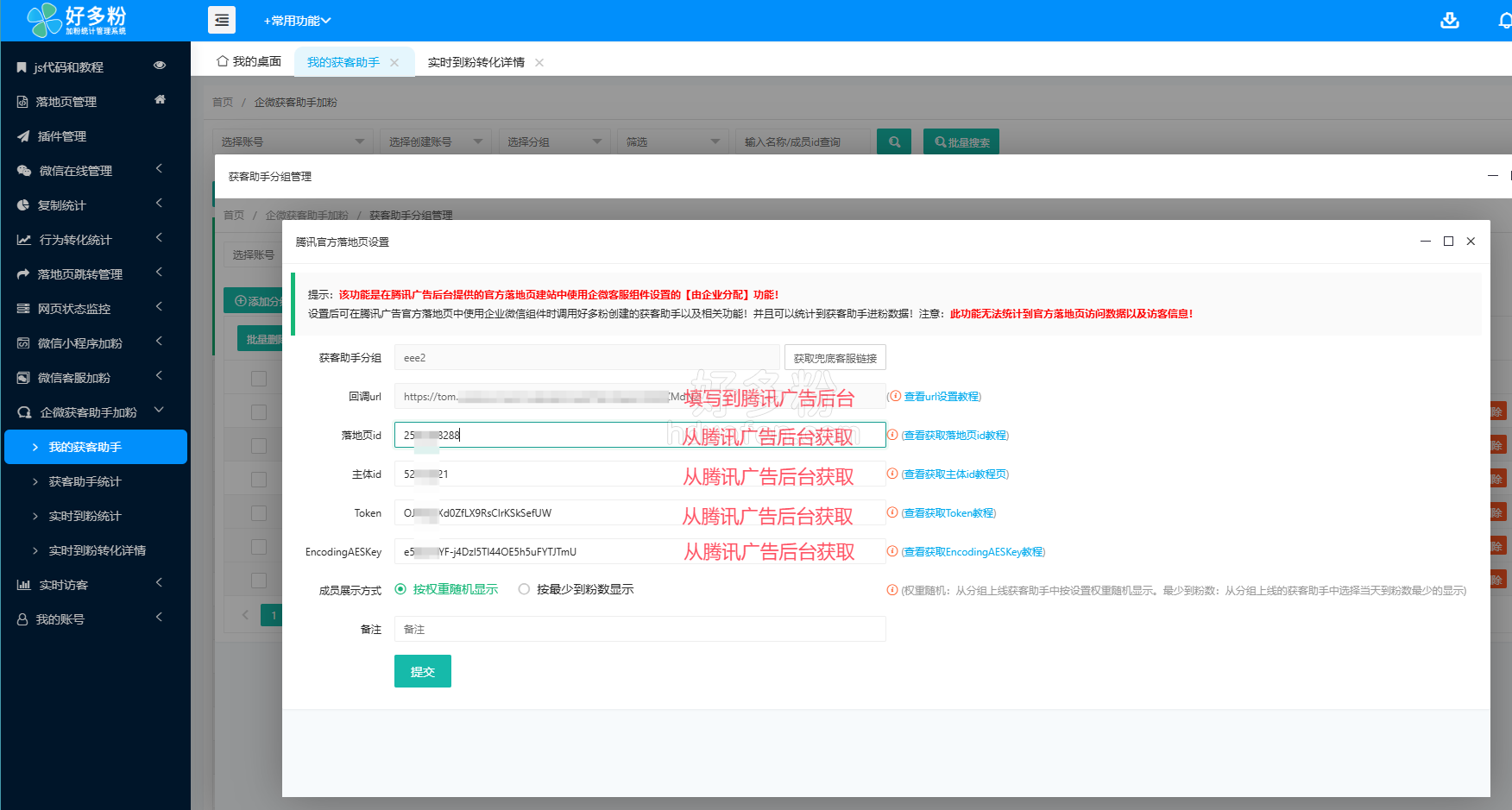 以下教大家如何在腾讯广告后台的官方落地页功能中设置企微组件,并且调用好多粉系统创建的获客助手使用。