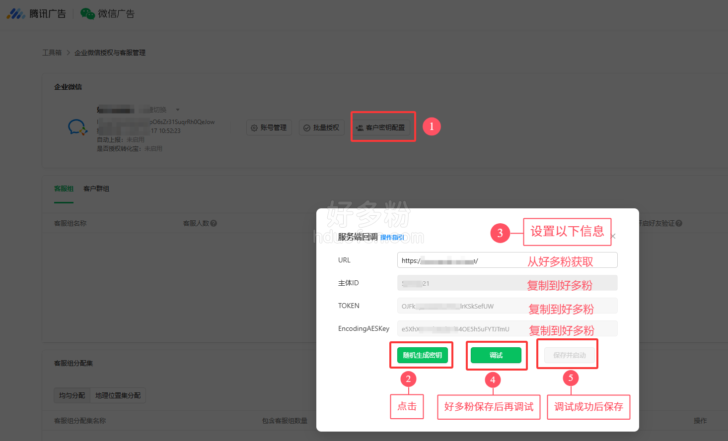 3.秘钥设置,url需要在好多粉后台获取,主体id,token,encodingAESKey需要复制填写到好多粉后台,参考第三步,