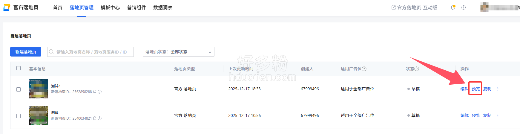 可点击落地页预览测试是否可以正常跳转到好多粉分配的获客助手