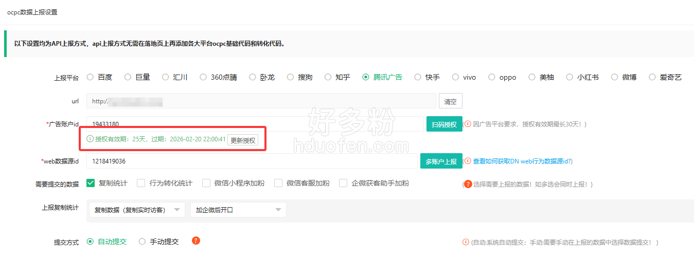 5.【更新】因腾讯广告账户授权规则变更,已更新数据上报中腾讯广告账户授权过期时间显示-单次授权有效期最长30天,必须每30天内重新授权一次,否则授权过期后无法继续上报。