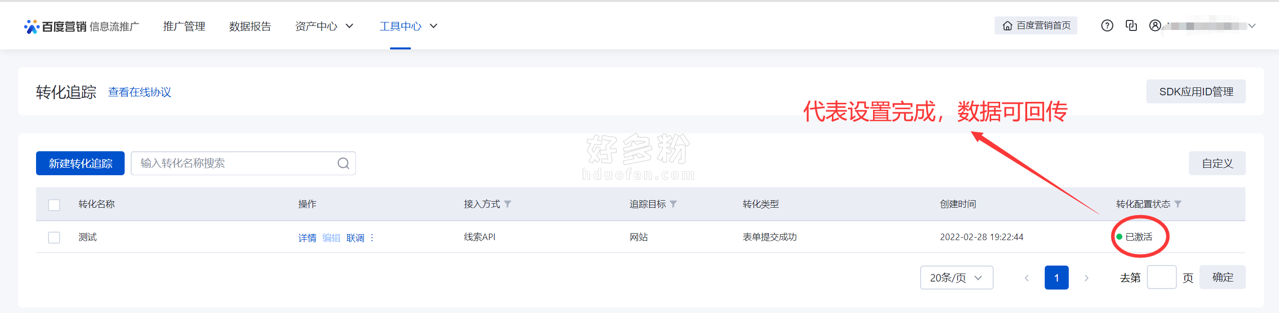 激活成功后,返回到广告平台刷新查看是否已联调成功。