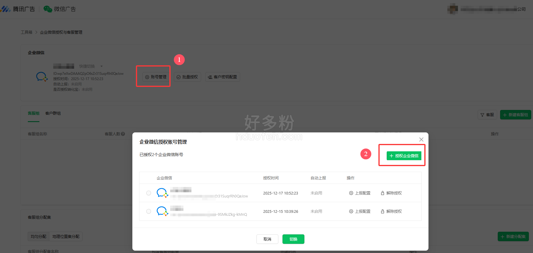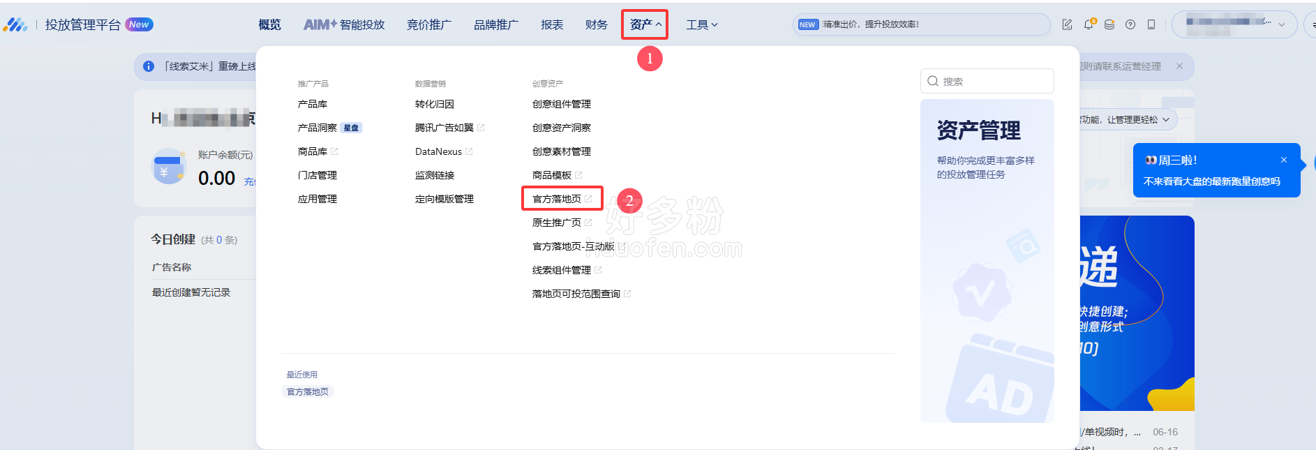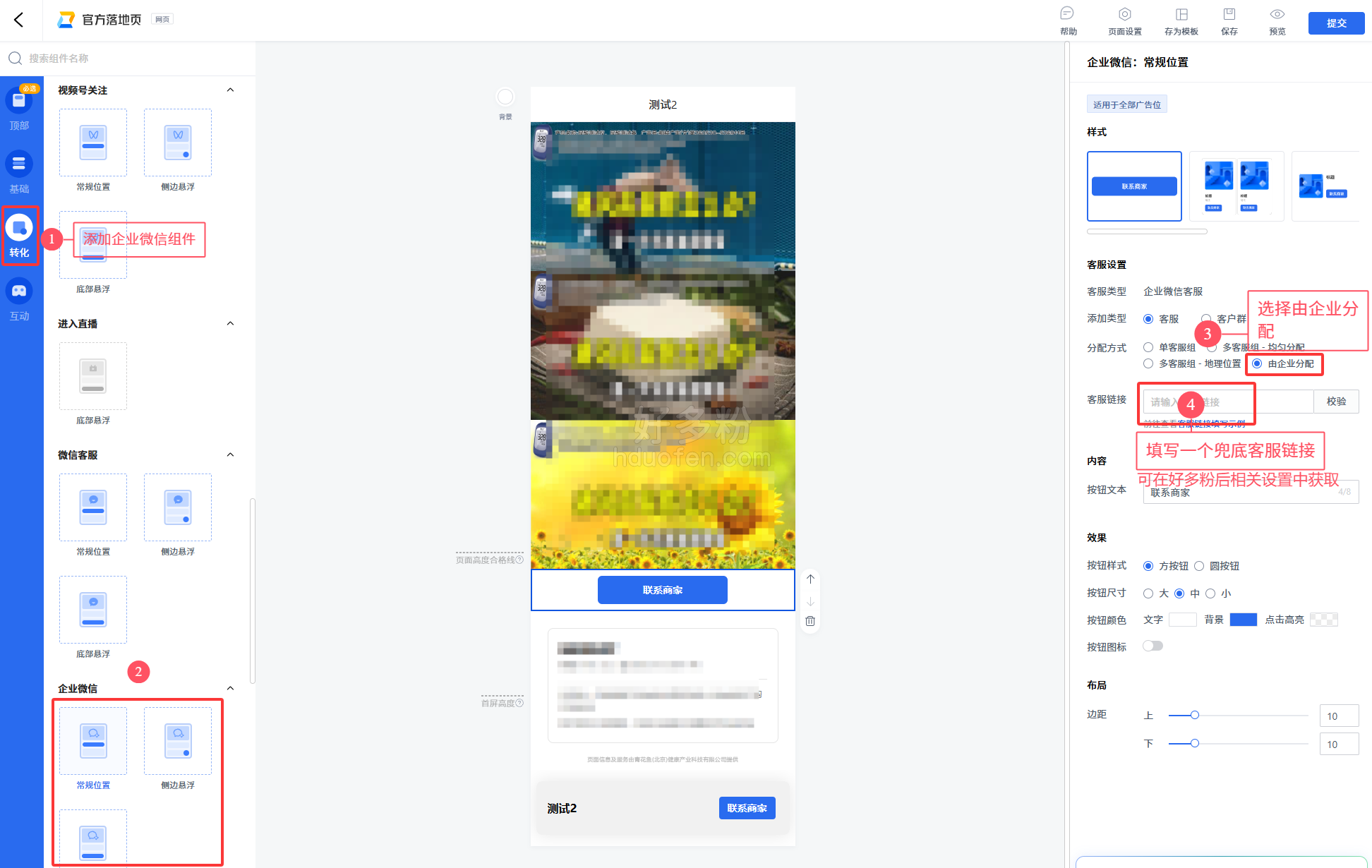 以下教大家如何在腾讯广告后台的官方落地页功能中设置企微组件,并且调用好多粉系统创建的获客助手使用。