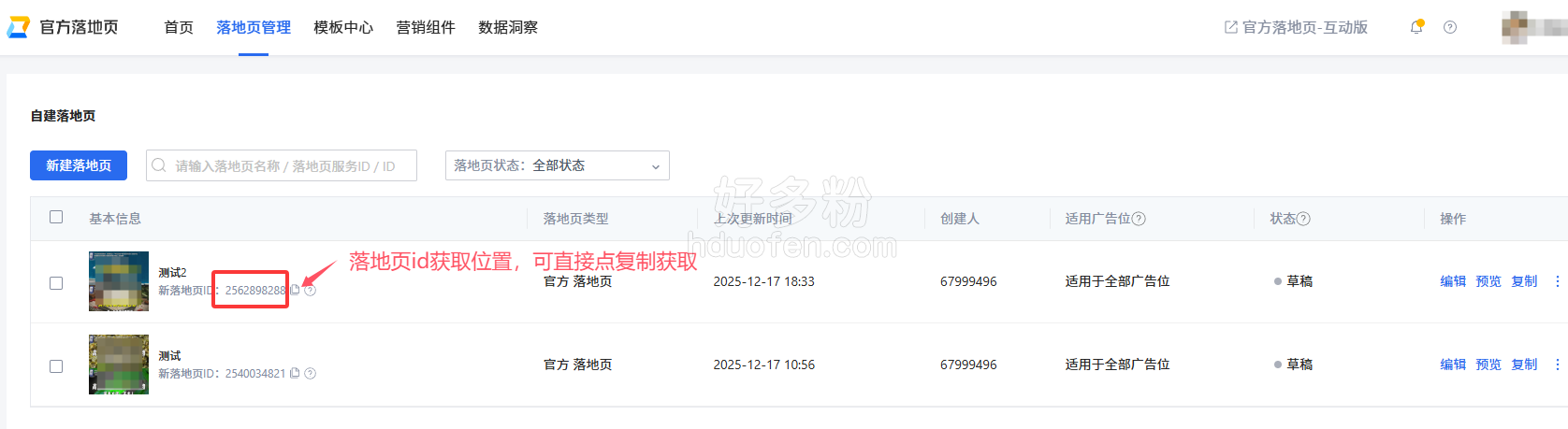 新建好的落地页在这获取落地页id,好多粉后台需要填写落地页id,可以从这里复制