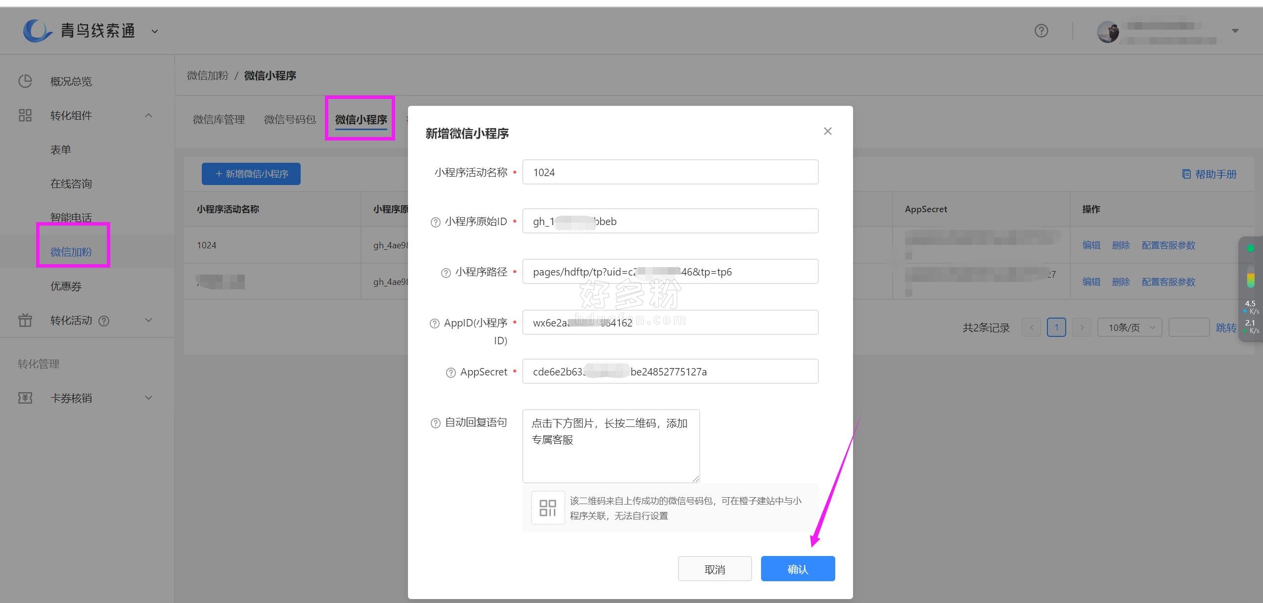 微信小程序跳转功能支持在头条橙子建站的推广链接上跳转至小程序,设置后同样可以打开微信小程序进行长按识别添加! 方法1使用步骤: 1.点击小程序其他网站设置-点击橙子建站设置: 2.橙子建站落地页添加按钮-设置跳转链接: 方法2使用步骤: 1.打开青鸟线索通:①添加微信号-②添加微信号码包-③新增小程序 小程序原始ID和小程序路径从百度基木鱼设置中获取一样通用 ,APPID和APPSecret登录小程序后台获取 2.登录小程序后台设置消息推送的参数: 3.点开橙子建站设置:组件-微信加粉-小程序