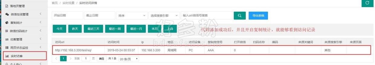 通过浏览器访问刚刚添加的链接后,后台【实时访客】中就会有一条访问记录;如下图: