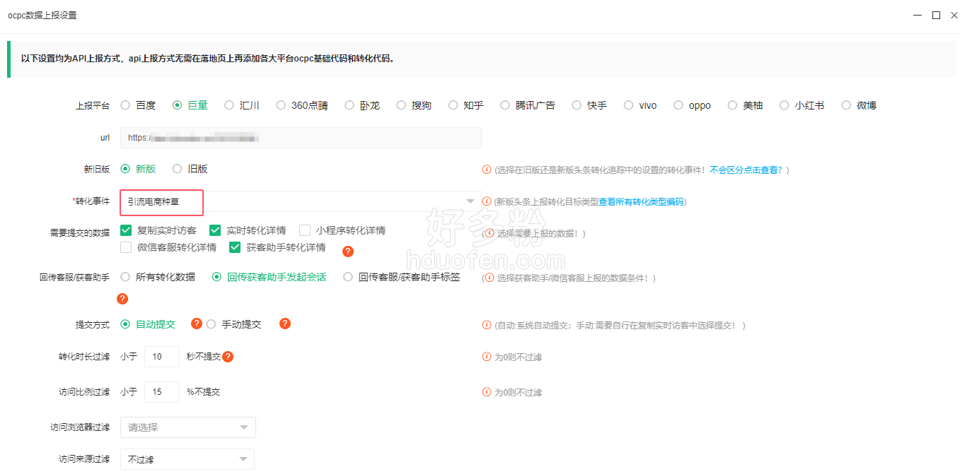 好多粉5.8.6版已更新。 本次更新主要新增插件支持批量修改功能,新增巨量广告部分新的转化类型。 更新详情: 【新增】插件管理批量修改功能。 【优化】巨量广告新增数据上报转化类型。 【优化】获客助手标签统计。 【优化】子账号管理搜索功能。 更新功能介绍: 1.【新增】插件管理批量修改功能。 2.【优化】巨量广告新增数据上报转化类型。 如有其他想添加的实用功能,可联系在线技术反馈,如功能适合使用我们会开发出来便于您使用!