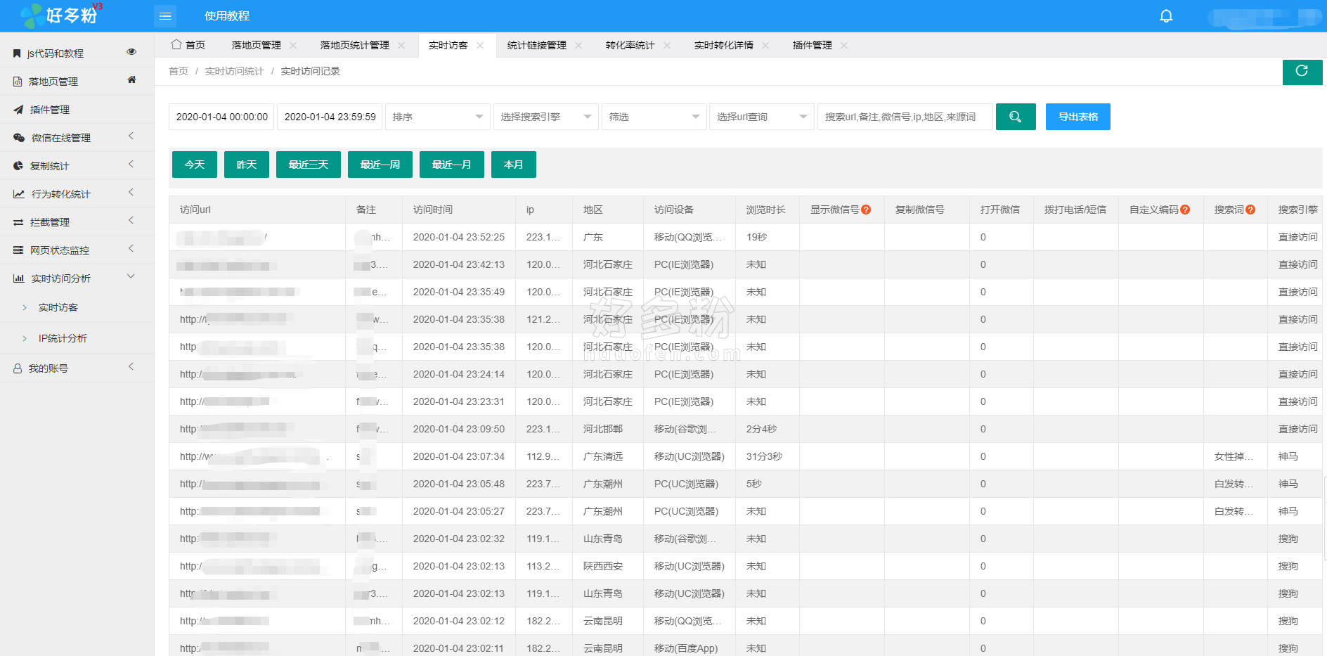 支持移动端和PC端,更加全面的推广页面上的微信号或者关键词的复制行为统计,让所有加粉来源有据可查!提供复制来源,搜索引擎,搜索关键词,地域、访问时长、浏览百分比、以及自定义编码统计等。